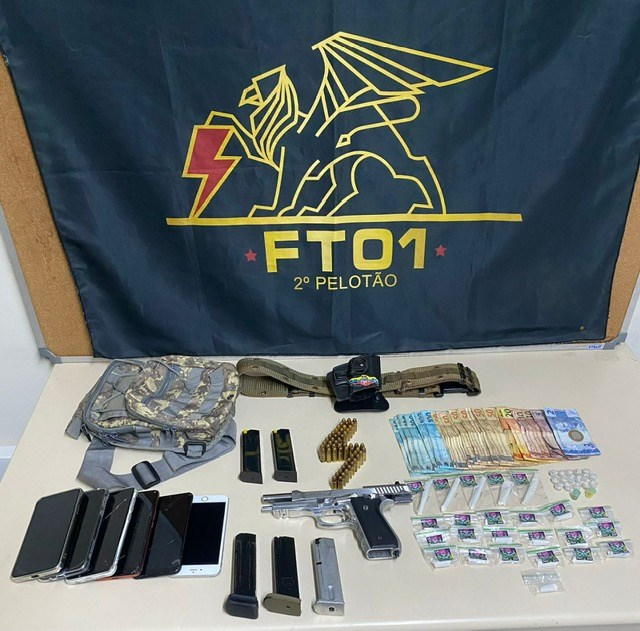 Já na sexta-feira (07), no bairro São Benedito, a Força Tática deteve um indivíduo com mandado de prisão em aberto em posse de uma pistola calibre 9mm; cinco carregadores; 56 munições cal 9mm; um cinto de guarnição com um porta-coldre; seis aparelhos celulares; uma bolsa; R$ 3.605,00 em espécie; 24 unidades de pac; 16 unidades de haxixe; e duas unidades de crack.
