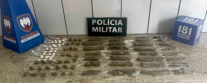 No bairro João Alves, durante patrulhamento preventivo, a equipe realizou diligências nas imediações após abordar um indivíduo em atitude suspeita. Durante as buscas no local, os militares localizaram uma sacola enterrada contendo 30 buchas de maconha, 31 porções maiores da mesma substância e 31 pedras de cocaína.