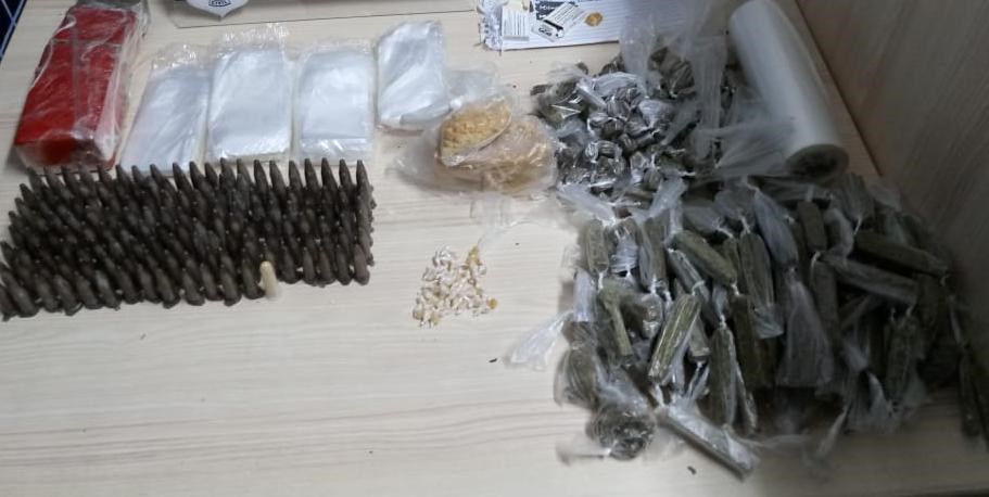 Com eles foram apreendidos 157 pinos de cocaína, 47 pedras de crack, 2 pedaços grandes de crack, 1 pedaço grande de maconha, 156 buchas de maconha e 136 pedaços maiores de maconha.