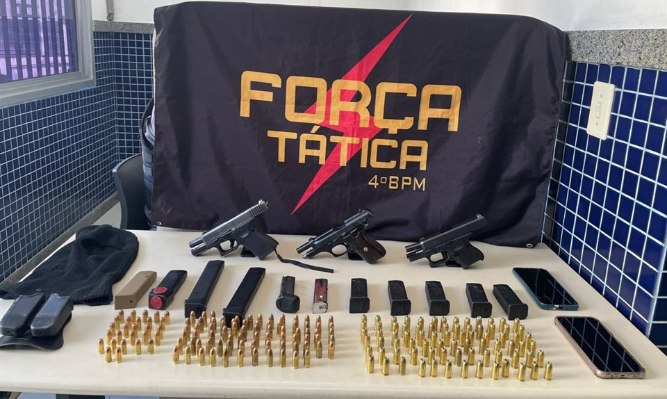 Entre os materiais apreendidos estão três pistolas (calibres 380, .40 e 9mm), 181 munições, carregadores, celulares, uma touca ninja e um porta carregador, além do veículo adulterado utilizado pelos indivíduos.