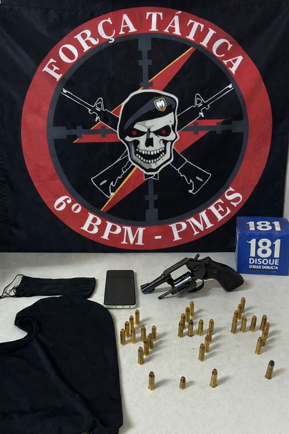 Na busca pessoal, foi apreendido um revólver calibre 38 com numeração suprimida, munições de calibres 38 e 380, além de um aparelho celular e uma balaclava.