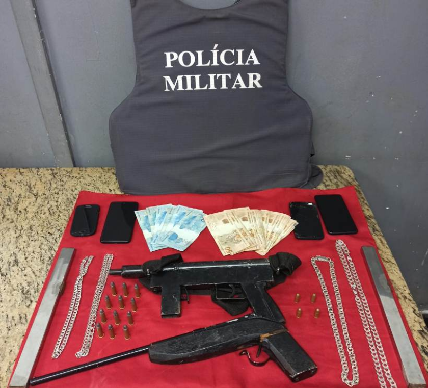 Durante a operação, a equipe de policiais foi até a casa de um dos suspeitos e encontrou enterrado no quintal uma metralhadora com dois carregadores com capacidade para 30 munições cada um, uma garrucha de cano longo, 12 cartuchos calibre 38 e quatro munições calibre 380, além de mais de 2 mil reais, em dinheiro proveniente dos roubos.