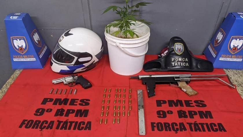 Durante patrulhamento, a equipe Força Tática prosseguiu à Rua Otacílio Silva Santos para averiguar informação de suspeitos armados em uma residência abandonada. No local, foram avistados cinco suspeitos, que fugiram ao perceberem a presença policial. Contudo, dois deles foram alcançados e abordados, sendo apreendidos com eles uma submetralhadora de fabricação artesanal calibre 9mm e um revólver calibre 357, além de um carregador, 34 munições calibre 9mm, seis munições calibre 357, e um pé de maconha.