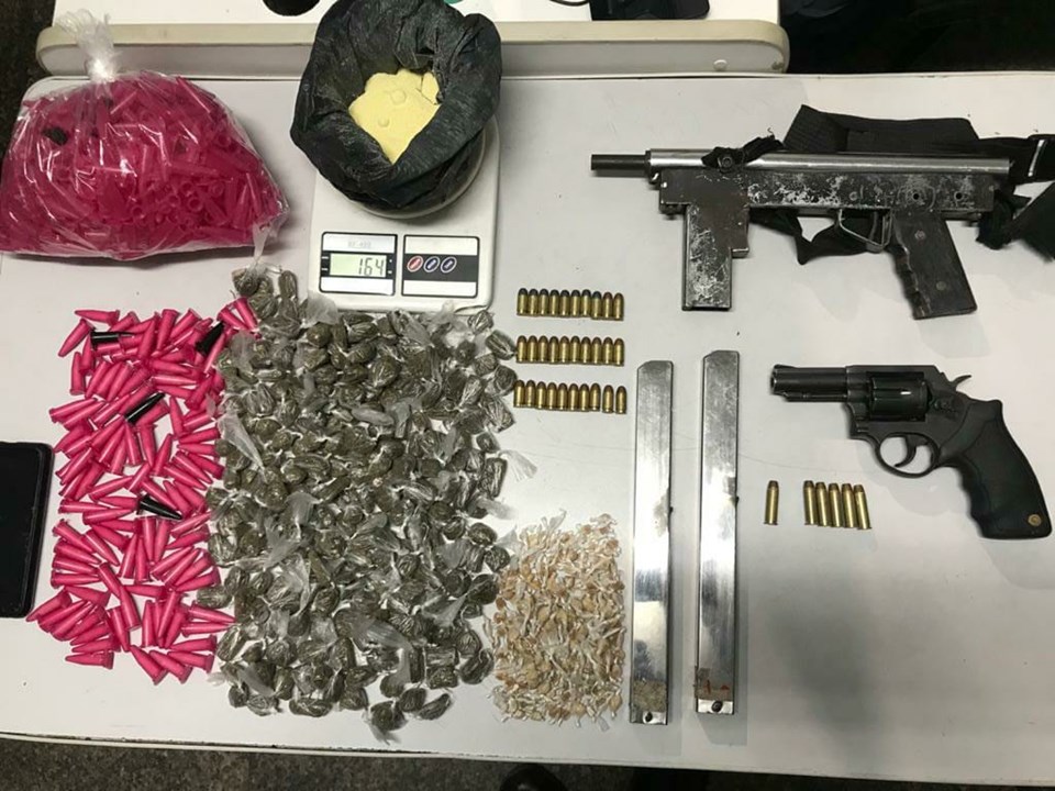 Durante ações de abordagem a alguns indivíduos no bairro Guanabada, os militares da Força Tática apreenderam uma submetralhadora calibre 380, um revólver calibre 38, 30 munições calibre 380, seis munições de calibre 38, dois carregadores alongados, 165 pedras de crack, 224 buchas de maconha, 107 pinos de cocaína, 164 gramas de cocaína e um celular .