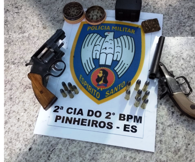 Policiais militares do 2º Batalhão prenderam, na noite desta sexta-feira (16), dois jovens e apreenderam uma adolescente, durante ação no município de Pinheiros. Com o trio foram apreendidas duas armas de fogo e um tablete de maconha.