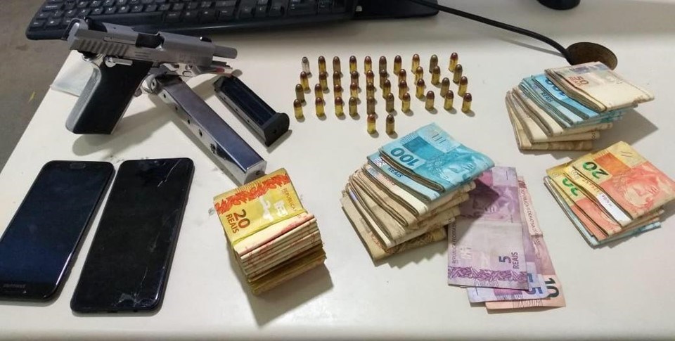 Com a dupla foi apreendida uma pistola calibre 380, dois carregadores, sendo um alongado; 42 munições calibre 380; e mais de R$ 17.000,00 reais em espécie.