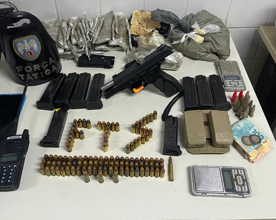 No total, foram apreendidos aproximadamente 1kg de cocaína, 13 pinos e três papelotes da mesma substância; uma porção de crack; duas porções de haxixe; 56 buchas e oito pedaços de maconha. Além disso, a equipe encontrou R$ 738,00 em dinheiro, uma pistola TH40 com número de série suprimido, oito carregadores calibre .40, dois carregadores 9mm, 111 munições calibre .40, três munições calibre .38 e uma munição calibre 5.56.