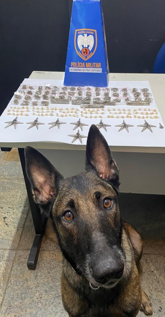 No sábado (08), os militares receberam uma denúncia de que um homem estaria traficando drogas próximo ao quiosque 04 da orla da Praia do Morro. No local, não foi possível encontrar o suspeito, mas com o emprego do cão Lobo, os policiais localizaram 43 pedras de crack e 16 buchas de cocaína enterradas na areia.
