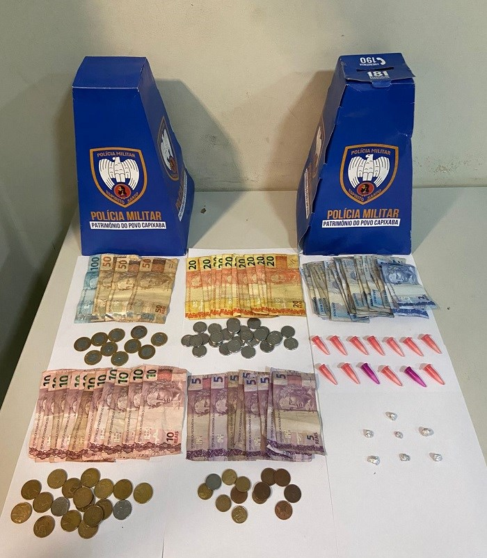 Por volta das 20h, mais entorpecentes foram apreendidos em uma ação no bairro Praia do Morro, totalizando sete pedras de crack e 13 pinos de cocaína que estavam em posse de um homem que estava traficando no local. Foi apreendido ainda R$ 811,75 em posse do abordado.