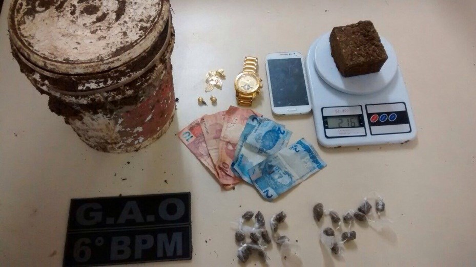 Nesta quinta-feira (20), os militares foram orientados a prosseguir ao Bairro das Laranjeiras para verificarem uma denúncia de assalto. Próximo ao local informado, foram vistas duas pessoas correndo, sendo que uma delas aparentemente estaria com uma arma de fogo na mão. Apesar dos suspeitos terem pulado muros de várias residências, os militares conseguiram abordá-los. Após vasculharem o local onde os rapazes estavam os policiais apreenderam 65 pedras de crack, 35 buchas de maconha e um simulacro de pistola. Os indivíduos foram detidos.