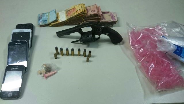 As equipes do BME patrulhavam a região quando avistaram um grupo em atitude suspeita próximo a um beco. Após a revista pessoal e buscas no local da abordagem, foi localizado um revólver calibre 38 com a numeração adulterada, seis munições de calibre 38, duas munições de calibre 380, uma bucha de maconha, quatro pedras de crack, um pino de cocaína, vasto material para embalo dos entorpecentes, R$ 5.574,00 em espécie e uma caderneta contendo anotações referentes ao tráfico de drogas.