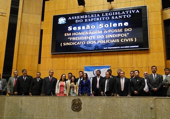 Uma sessão solene na Assembleia Legislativa do Estado do Espírito Santo (Ales) marcou a posse da nova diretoria do Sindicato dos Policiais Civis do Estado do Espírito Santo (Sindipol) na noite dessa quinta-feira (13). A chefe de Polícia, delegada Gracimeri Gaviorno, esteve presente para prestigiar a solenidade proposta pelo deputado estadual, Euclério Sampaio.