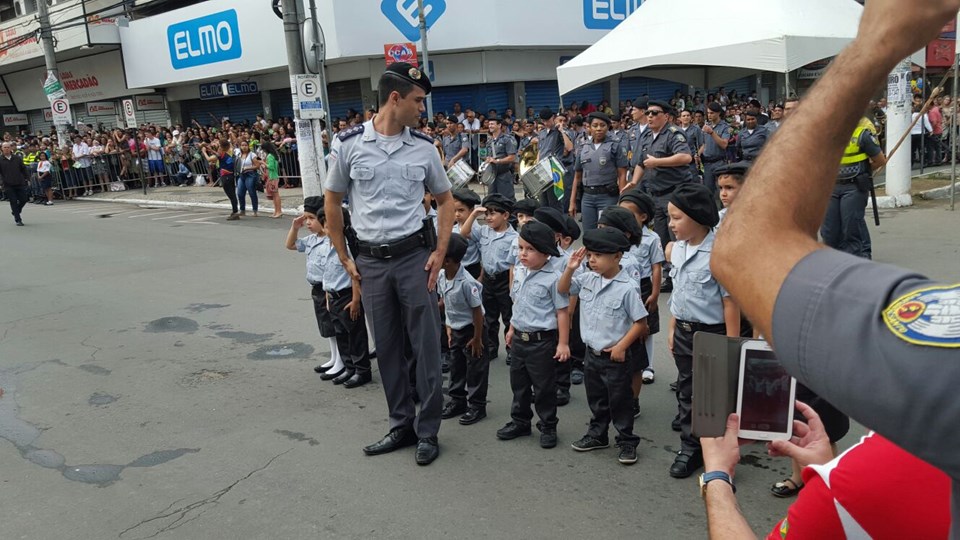 Crianças desfilam com a Polícia Militar em evento na Serra