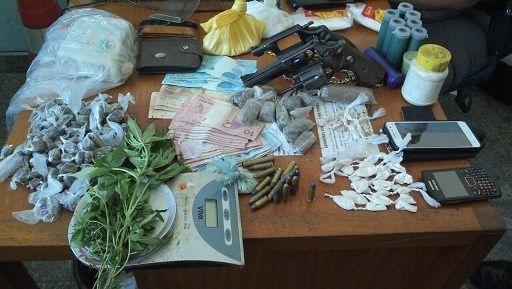 quatro calibres 38 e um 32, 68 munições de diversos calibres, um tablete de crack,
