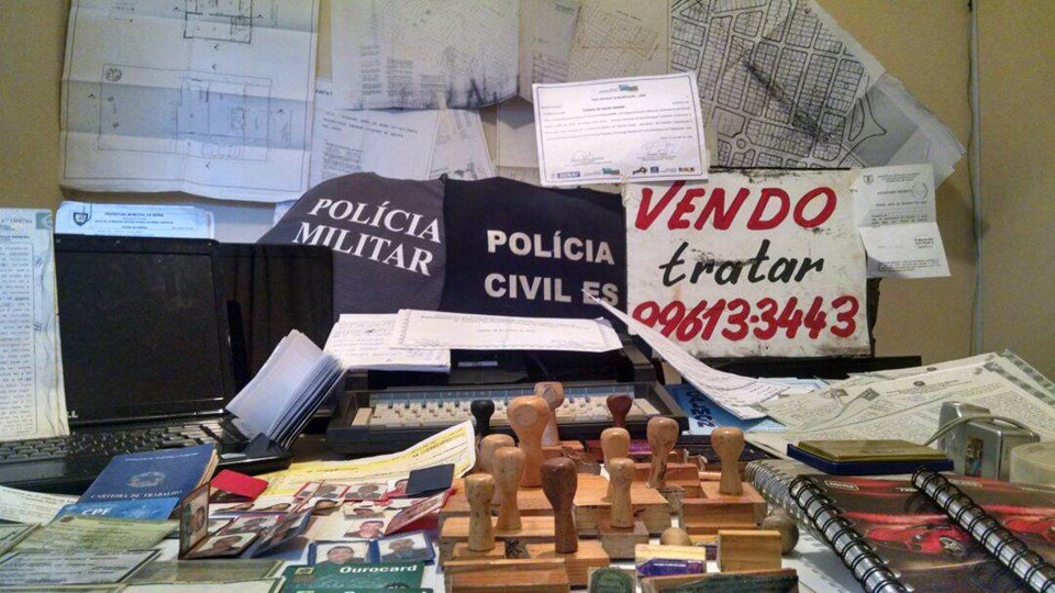 De acordo com o titular da Delegacia de Polícia (DP) de Fundão, delegado Rodrigo Henrique da Rosa, além dos documentos falsificados referentes à compra e venda de imóveis nos municípios da Serra e Fundão, na casa do detido os policiais também encontraram plantas de loteamentos, diplomas falsos, blocos de atestados médicos em branco, documentos de identidade com dados raspados, diversas fotos 3x4 de outras pessoas e vários carimbos falsos, inclusive de cartórios e de órgãos relacionados à certificação de diplomas.