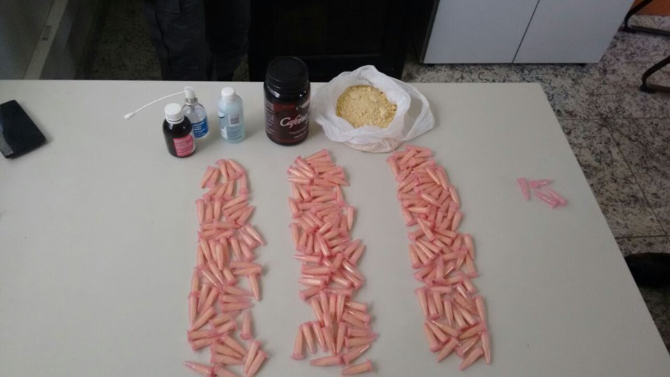 Dentro havia 200 pinos de cocaína, aproximadamente 320 gramas de pasta base do mesmo entorpecente, um frasco de lidocaína, um frasco de acetona, um frasco de éter e um frasco de cafeína.