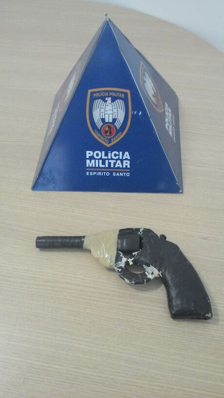 Os militares foram informados sobre o roubo e realizaram buscas pelo local. O adolescente foi visto e abordado. Além do simulacro, com ele também foram encontrados dois celulares que haviam sido roubados de duas jovens.