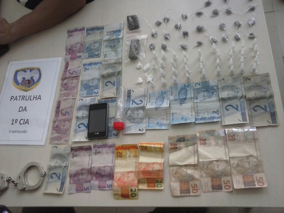 Os suspeitos foram abordados em um local conhecido pelo intenso tráfico de drogas. No total foram apreendidos 35 pinos de cocaína, quatro papelotes da mesma droga, 26 buchas de maconha e duas buchas maiores do mesmo entorpecente, além de R$ 241,00 em espécie.