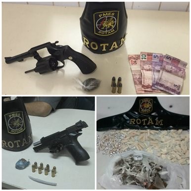 Os policiais do Batalhão de Ronda Ostensiva Tática Motorizada (Rotam), Unidade Especializada da PMES detiveram oito pessoas, entre elas um homicida foragido da Justiça, neste final de semana. Além disso, os policiais apreenderam duas armas de fogo, drogas e recuperaram um veículo roubado. Todos os detidos e os materiais apreendidos foram encaminhados ao respectivo plantão policial onde se deu o fato.
