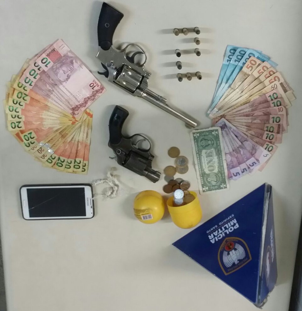 Policiais militares do 6º Batalhão prenderam um indivíduo com duas armas de fogo durante patrulhamento no Bairro das Laranjeiras, na Serra. A ação aconteceu no final da noite deste domingo (26) e também resultou na apreensão de drogas e dinheiro.