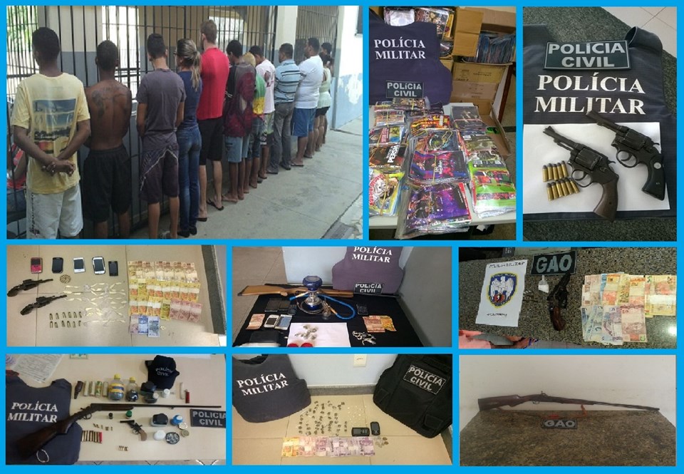 Já na madrugada desta quinta-feira (12), foram cumpridos mais 28 mandados de prisão e busca e apreensão que resultou em sete armas de fogo apreendidas, sendo três revólveres, uma garrucha e três espingardas, munições de diversos calibres, 6.844 CDs e DVDs piratas, 69 buchas de maconha, 35 papelotes de cocaína, 85 pedras de crack, três trituradores de drogas, dois narguilés (instrumento utilizado para consumo de drogas), diversos celulares e outros materiais.