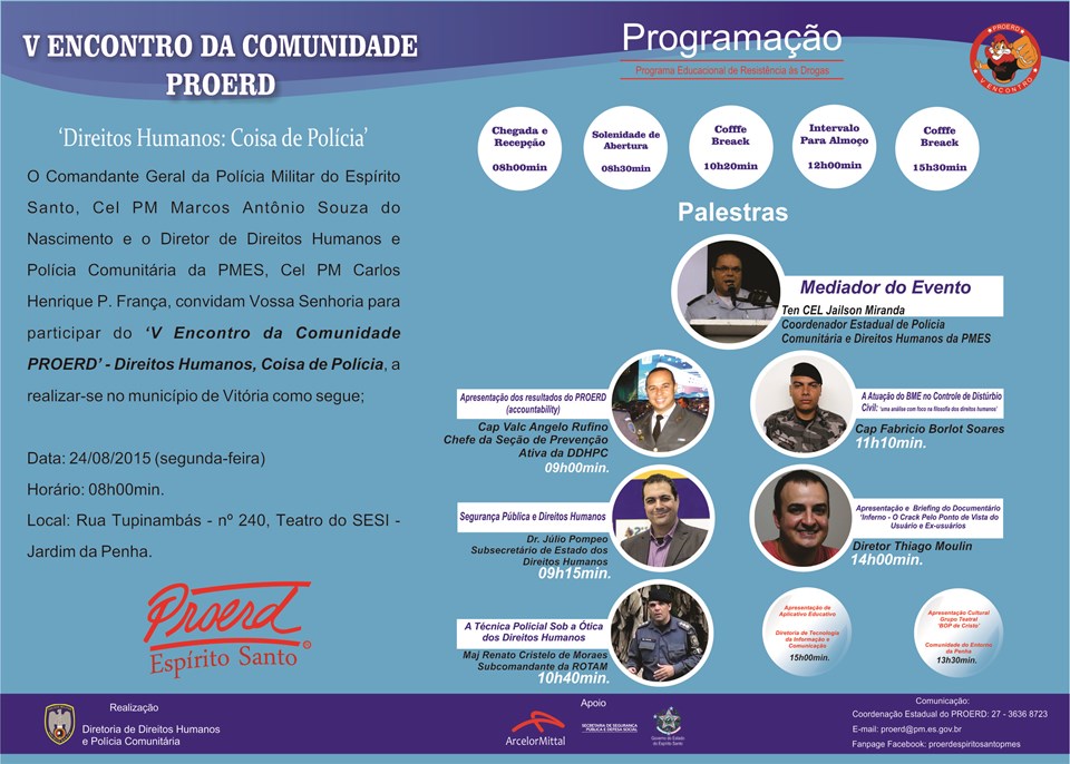 Durante o evento será realizada a prestação de conta do plano de trabalho da Diretoria de Direitos Humanos e Polícia Comunitária (DDHPC), considerando os objetivos e metas alcançados do Programa Educacional de Resistência às Drogas (Proerd), no período de 2011/2014 e primeiro semestre 2015 e atendimentos por Unidades da PMES.
