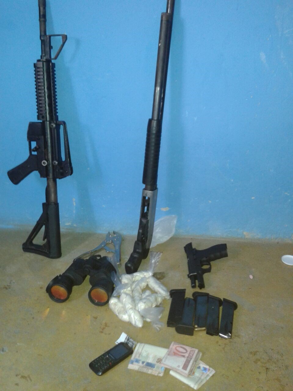 Além das armas de fogo, os militares apreenderam oito tabletes de maconha, 144 pedras de crack, 200 pedras de haxixe, 110 papelotes de cocaína, cinco carregadores de pistola, 29 munições calibre 40, um carregador 9 mm e 16 munições do mesmo calibre.