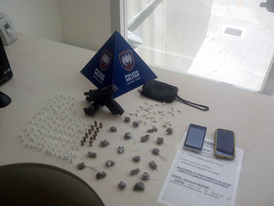Os policiais realizavam o patrulhamento no bairro Jesus de Nazareth, quando abordaram três indivíduos, sendo que um era menor. Com o trio a equipe apreendeu uma pistola calibre 380 com numeração raspada, um carregador contendo 12 munições do mesmo calibre, 111 pinos de cocaína, 32 pedras de crack, 21 buchas de maconha e dois celulares.