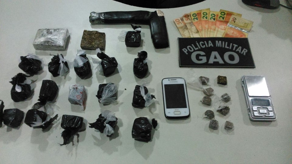 Com o adolescente de 14 anos foram apreendida nove buchas de maconha, a quantia de R$200,00 em espécie, um aparelho celular, dois tabletes de maconha, seis buchas de maconha, um simulacro de arma de fogo e uma balança de precisão.