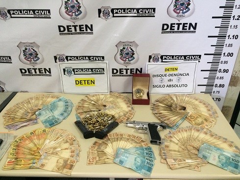 Na residência do suspeito os policiais apreenderam R$ 39.600,00 em espécie, dois cheques totalizando R$ 1.379,00, uma pistola calibre 380, diversas munições e dois carregadores. Segundo o responsável pela operação, delegado Fábio Almeida Pedroto, F.H. não soube explicar a origem do dinheiro.