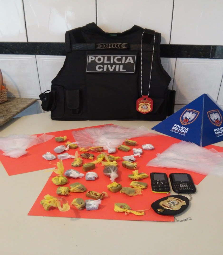 Policiais civis da Delegacia de Castelo em conjunto com militares do município, prenderam nessa quarta-feira (20) P.C.S.J., 24 anos, no bairro Volta Redonda. O rapaz é suspeito de realizar tráfico de drogas na região e com ele foram encontrados 32 tabletes de maconha, uma pequena sacola com a mesma substância entorpecente e material para embalar a droga.