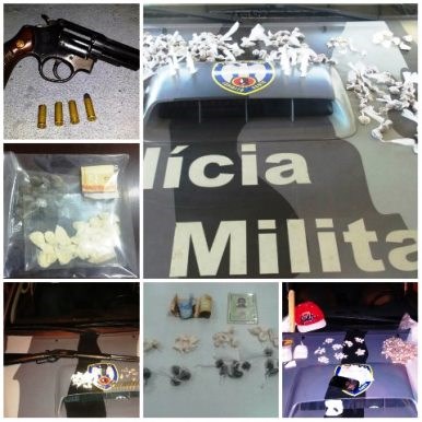 Do total foram apreendidos 166 papelotes de cocaína, 470 buchas de maconha, 183 pedras de crack, duas balanças de precisão, 400 gramas de cocaína e 200 gramas de maconha prensada. Além disso, também foram apreendidos um revólver calibre 38, uma carabina 44 winchester, um revólver calibre 32, R$ 1.027,55 em espécie e diversas munições.